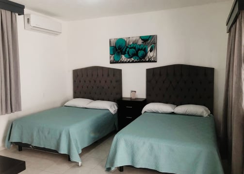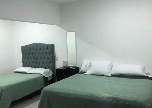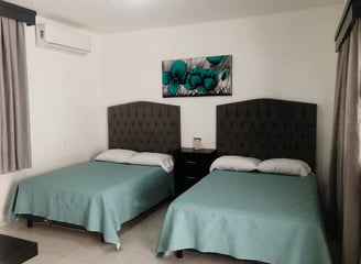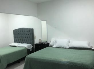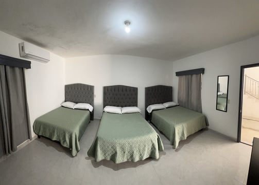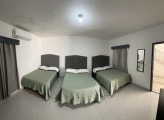 La habitación cuenta con 3 camas matrimoniales, ideal para familias o grupos.